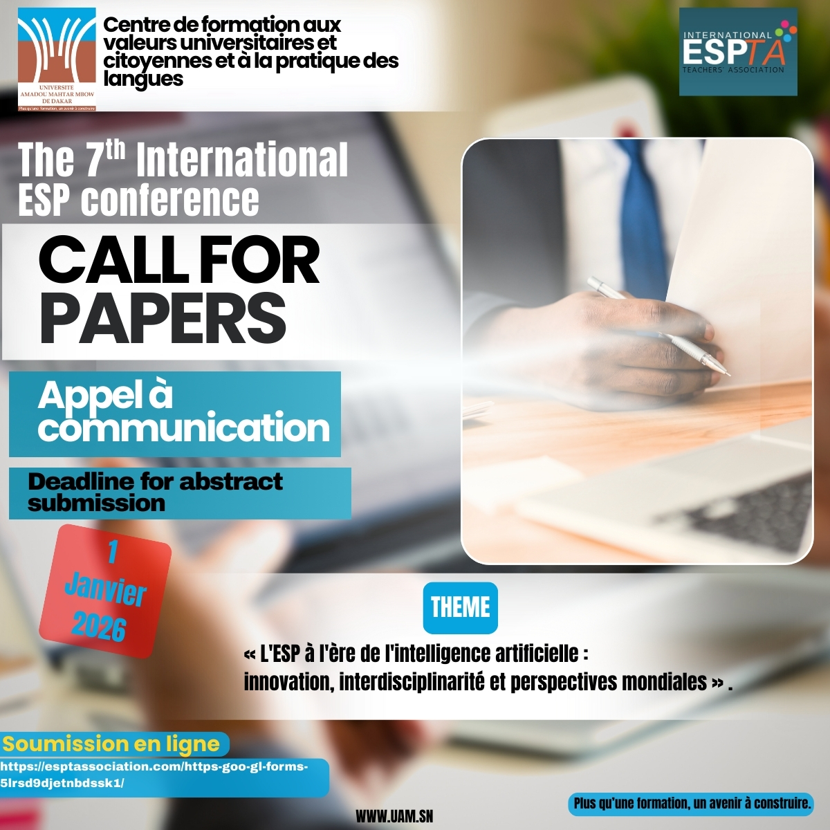 L’International ESP Teachers’ Association (IESPTA), en partenariat avec le CFVUCPL de l’Université Amadou Mahtar Mbow (UAM), vous invite à soumettre vos propositions pour ce rendez-vous majeur de l’anglais de spécialité.