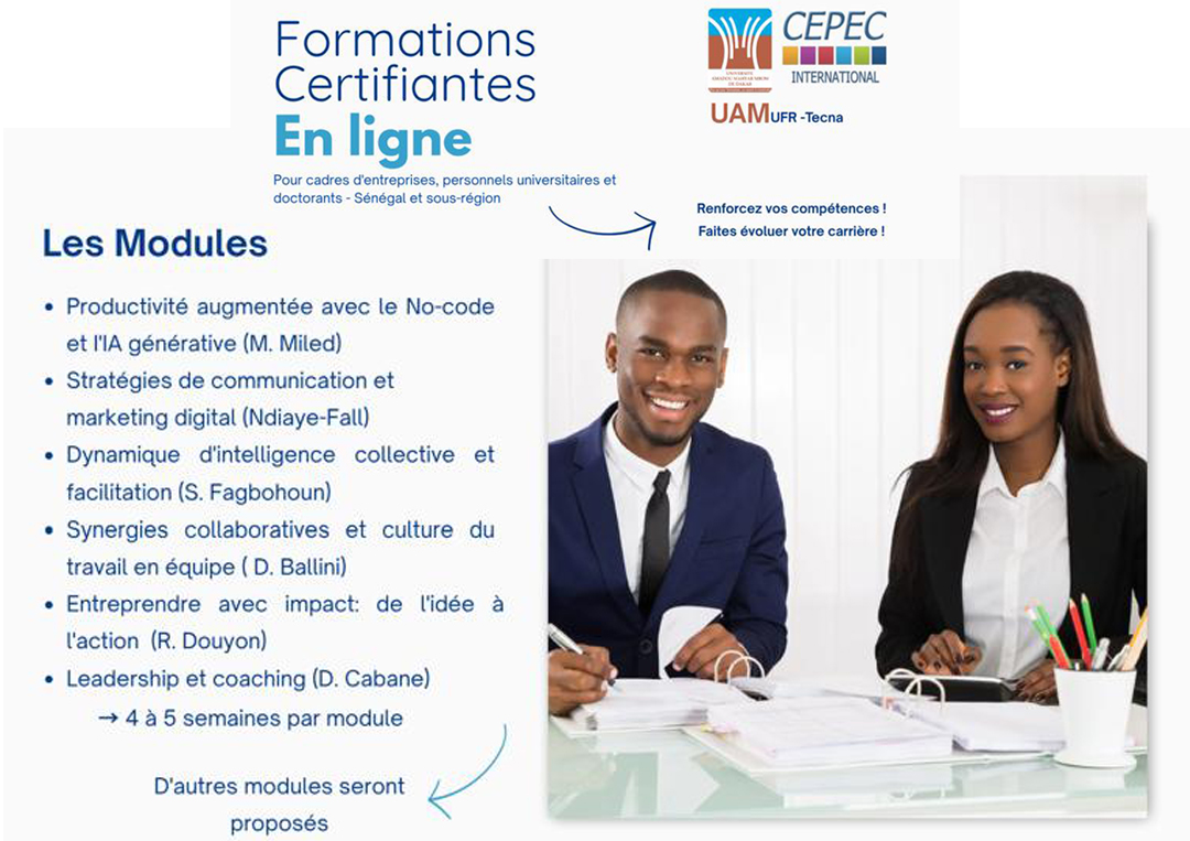 L’UFR Technologies de la Communication Numérique et de l’Audiovisuel (TECNA) de l’UAM, en partenariat avec CEPEC International, propose une série de formations certifiantes 100 % en ligne conçues pour accompagner la montée en compétences des acteurs du milieu académique et professionnel face aux enjeux de la transformation numérique.