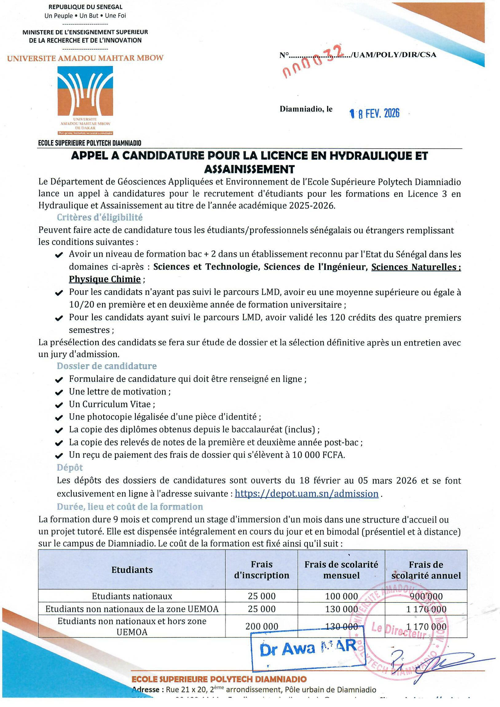 Les dépôts des dossiers de candidatures sont ouverts du 18 février au 05 mars 2026 et se font exclusivement en ligne à l’adresse suivante : https://depot.uam.sn/admission