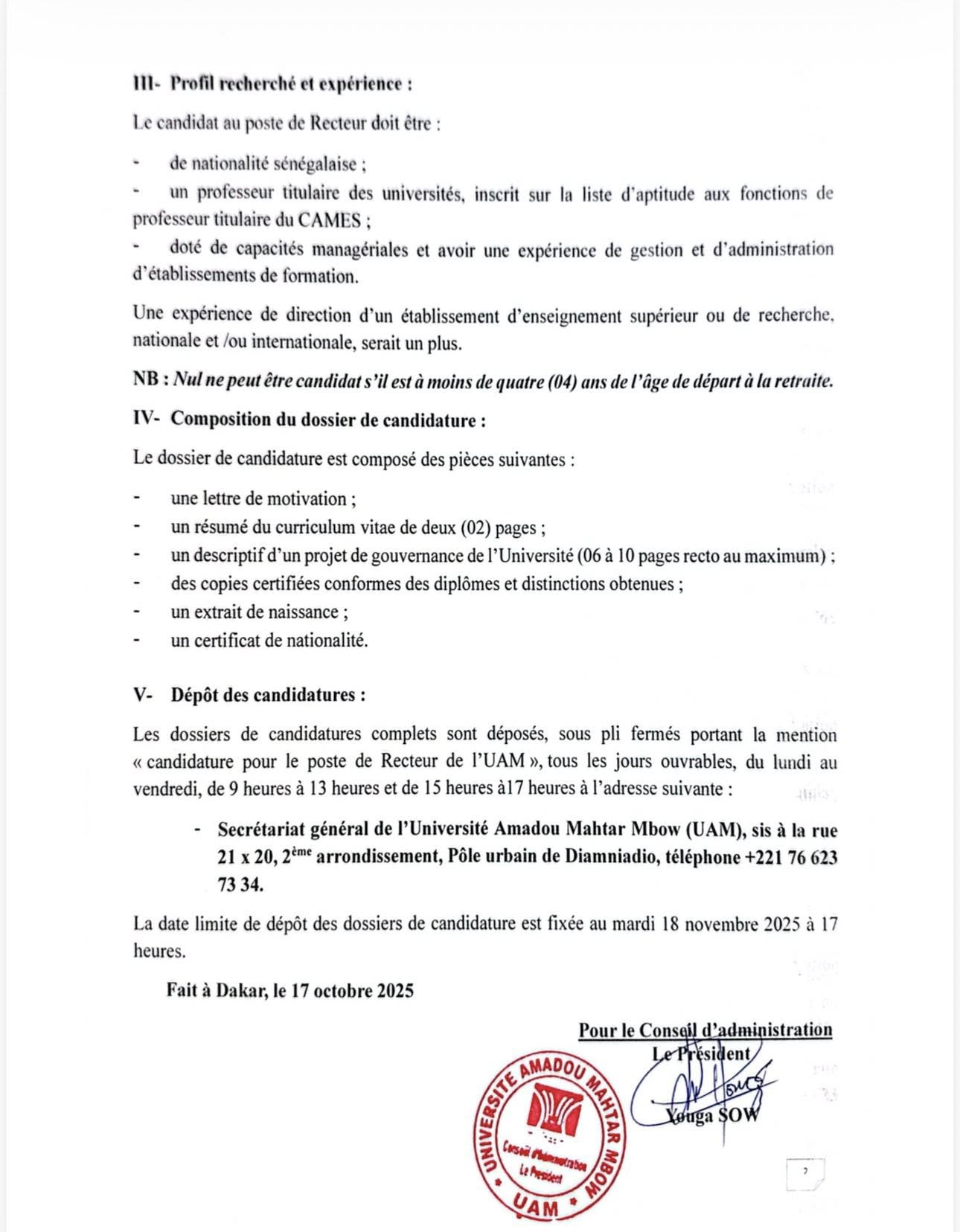 En application des dispositions des décrets n° 2021-846 du 24 juin 2021 relatif aux modalités de nomination du Recteur dans les universités publiques et n° 2021-1503 du 16 novembre 2021 fixant les règles d’organisation et de fonctionnement de l’Université Amadou Mahtar MBOW (UAM), il est lancé un appel à candidatures en vue de la nomination du Recteur de l’UAM.